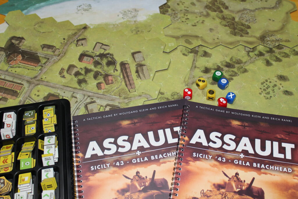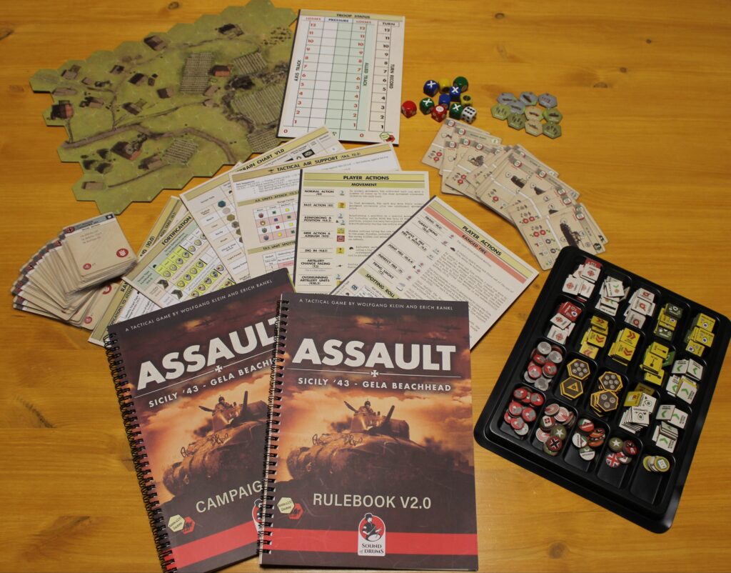 Damit ist die Bühne bereitet für das Hex&Counter Wargame Sicily´43 Gela Beachhead innerhalb des Assault Systems. Schöpfer sind Wolfgang Klein und Erich Rankl aus Bayern, gemeinsame Gründer von Assault Games. Erschienen ist das Spiel bei Sound of Drums und dort aktuell für 130,- € erhältlich.