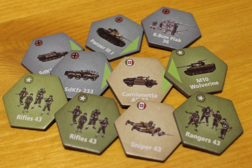 Die Besonderheit liegt jedoch in einer elegant einfachen und sehr effektiven Idee. Bei Fahrzeugen und Artillerie mit beschränktem Feuerbereich verfügt der Counter über einen Pfeil in einer der Ecken. Dieser zeigt die Ausrichtung der Einheit ein und muss immer auf eine der Ecken des Hexfeldes gerichtet sein, in welchem sich die Einheit befindet. So ist die Ausrichtung und der Feuerbereich immer klar definiert und kann nur durch Verbrauch von Bewegungspunkten verändert werden.