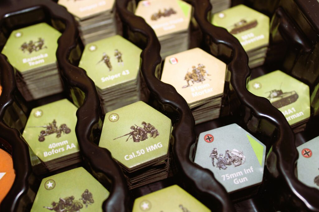 Die Spielfläche setzt sich je nach Szenario aus 1-6, wunderschön gestalteten Kartenteilen mit Hexfeldern zusammen. Es sind 12 Karten enthalten, beidseitig bedruckt und so lassen sich alle möglichen Land- und Ortschaften in verschiedensten Kombinationen erstellen. Das Spiel bringt 18 Würfel, 4 rote, 4 gelbe, 4 grüne und 4 blaue und 2x W6, 64 Einheitenkarten, 90 Formationskarten, 57 Kommandokarten und 72 TA/OAS Karten, dazu noch 4 Spielhilfen und über 700 Einheitencounter und Statusmarker für alle möglichen Verwendungen mit. Alle Komponenten sind von sehr hoher Qualität, die Illustrationen kommen aufgrund der schön großen Counter besonders gut zur Wirkung.
