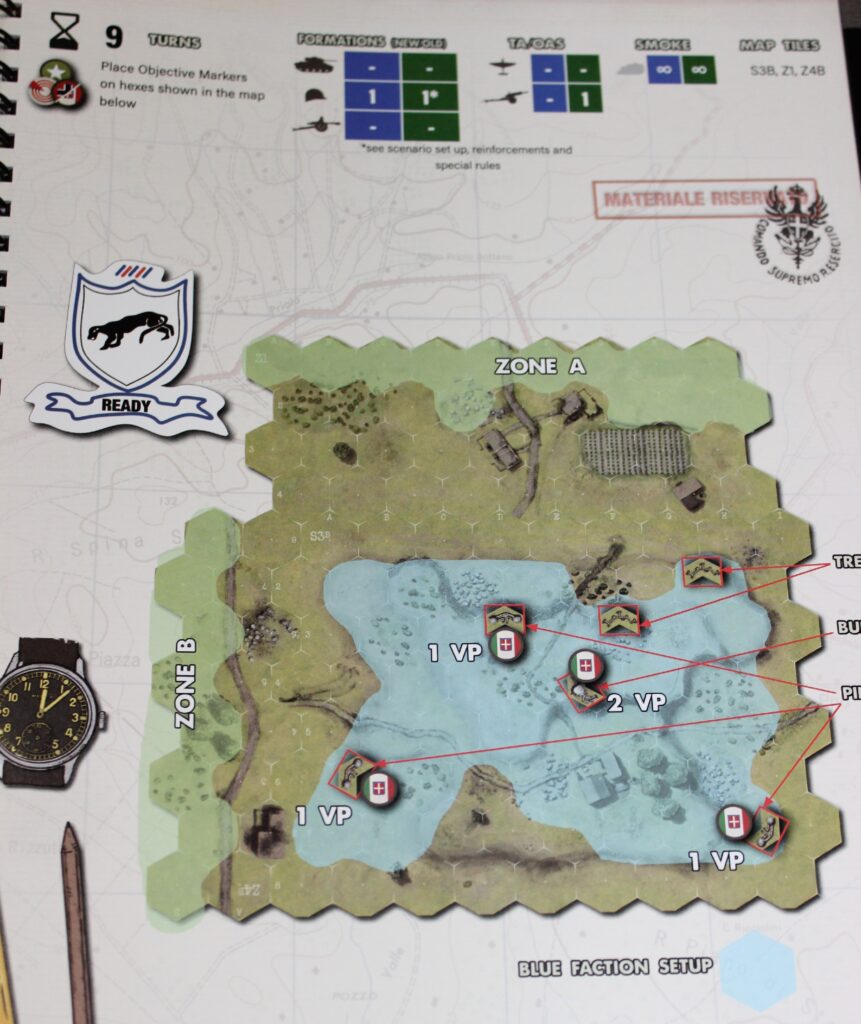 Jedes Szenario beginnt erstmal mit dem Setup, der Spielvorbereitung. Entsprechend der Szenariobeschreibung werden Kartenteile platziert und mit zusätzlichen Tiles modifiziert. So kommen Ruinen, Abwehrstellungen, Krater usw. hinzu. Die Siegbedingungen bestehen wargametypisch meist in der Eroberung bestimmter Siegpunkte auf der Karte, welche je nach Szenario verschiedene Werte besitzen. Wer am Ende des Szenarios die meisten Siegpunkte unter Kontrolle hat, gewinnt. Schließlich wird noch das Troop Status Board bestückt, beide Seiten ziehen ihre Formationskarten und erhalten Kommandopunkte, dazu später mehr.
