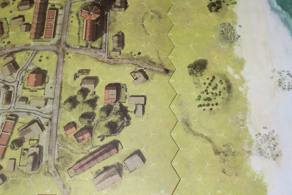 Die Kartenteile sind wunderbar illustriert, ebenso die Counter und Einheitenkarten. Für das Artwork daher ein großes Kompliment an Marc von Martial und Michael Grillenberger. Leider sind die Höhenunterschiede manchmal etwas schwer zu erkennen und könnten deutlicher sein. Ebenso ragen in seltenen Fällen Gebäudeteile oder andere lanschaftliche Merkmale in anliegende Hexfelder und könnten so für Diskussionen unter den Spielern sorgen. Wir sprechen hier aber von Meckern auf höchstem Niveau und diese Aspekte werden bereits im nächsten Ableger des Systems – Red Horizon ´41 Revised – optimiert.