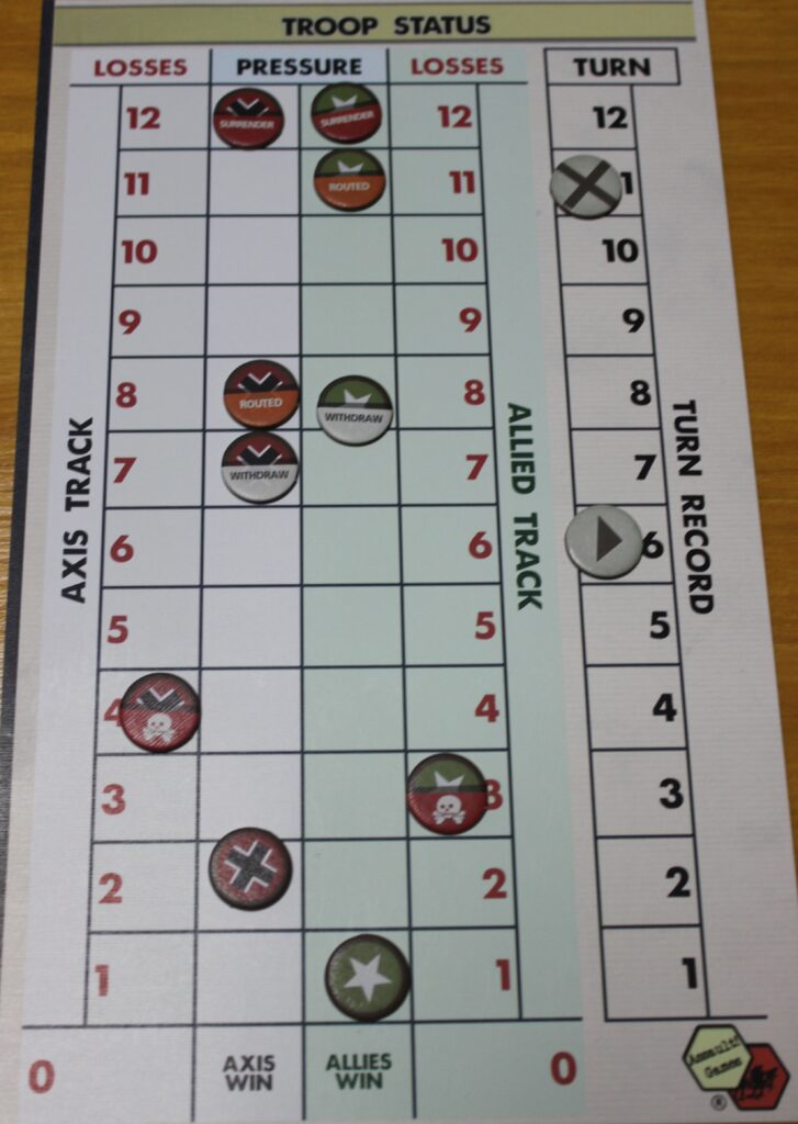 Das Troop Status Board wird genutzt, um den moralischen Zustand der Einheiten insgesamt abzubilden und enthält den Rundenzähler. Für die einzelnen Szenarien gibt es jeweils eine Vorgabe wie das Board zu bestücken ist. Wann immer eine Seite eine Einheit verliert wird der Wert der Einheit dort abgetragen und übersteigt man einen Wert von 12 wird der eigene Verlustmarker ein Feld weiter vorgerückt. So kann es sein, dass die eigenen Einheiten die Stati Rückzug, Auflösung und Aufgabe erreichen. Dies kann zu einem vorzeitigen Ende des Szenarios führen.