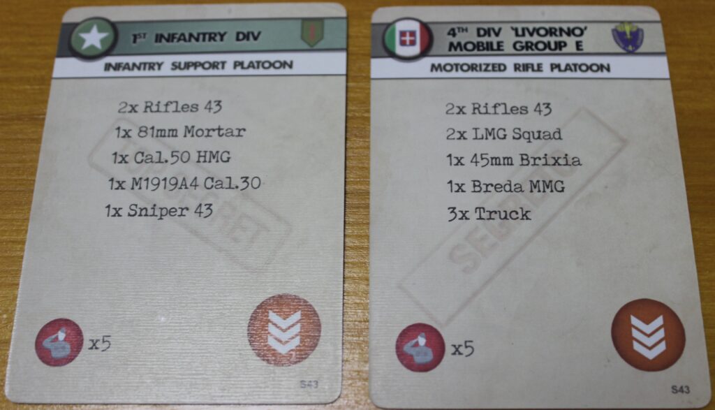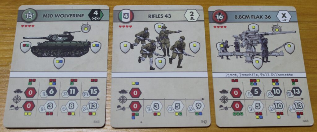 Bei Assault gehört nun zu jeder Einheit eine Einheitenkarte. Diese enthält den Punktwert der Einheit, ihre Bewegungsrate, Sonderfähigkeiten, die verfügbaren Verteidigungs- und Angriffswürfel und eine Illustration der Einheit. Zusätzlich zu den Countern im Spielbereich hat also jede Seite die Karten ihrer Einheiten vor sich liegen. Dies hat einen großen Vorteil: Man muss sich nicht quer über den Tisch beugen und sich einen winzigen Counter irgendwo auf der Karte anschauen, um sich über die Werte zu informieren.