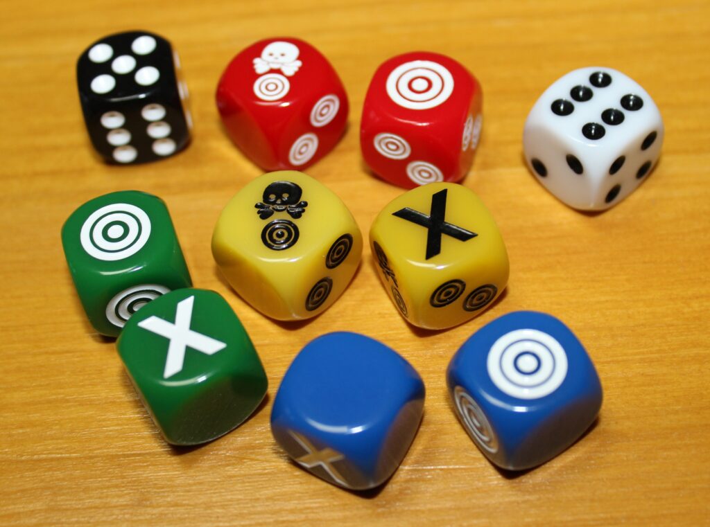 Kämpfe werden in Assault mit den Würfeln in vier Farben abgehandelt. Jeder Würfel verfügt über bis zu drei verschiedene Symbole, hier in absteigender Wertigkeit: