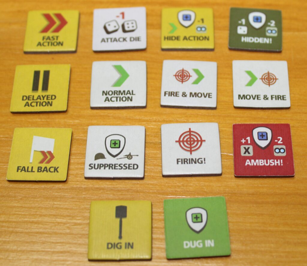 Außer den Countern gibt es noch mehrere hundert Status- und sonstige Marker, welche für den Spielablauf verwendet werden. Mit diesen wird oftmals angegeben, dass eine Einheit in diesem Zug aktiviert wurde, welche Aktion sie durchgeführt hat und je nach Marker wirkt sich die Aktion auch noch auf folgende Spielrunden aus oder modifziert den Würfelpool für bestimmte Situationen. Auch hier folgt das Spiel einem sehr einfachen Prinzip. Am Ende einer Runde werden in der Organisationsphase alle Marker mit weißem Hintergrund entfernt, alle Marker mit gelbem Hintergrund werden auf ihre weiße Seite gewendet, sodass diese in der nächsten Runde auch noch einen Effekt haben. Einige wenige sind rot oder dunkelgrün und werden nicht entfernt. Diese beschreiben dann einen dauerhaften Effekt, welcher nur durch bestimmte Aktionen aufgehoben wird wie z.B. eine eingegrabene Einheit oder eine Einheit in einer Hinterhaltsstellung, welche selbst agieren muss, um den Status zu verändern.