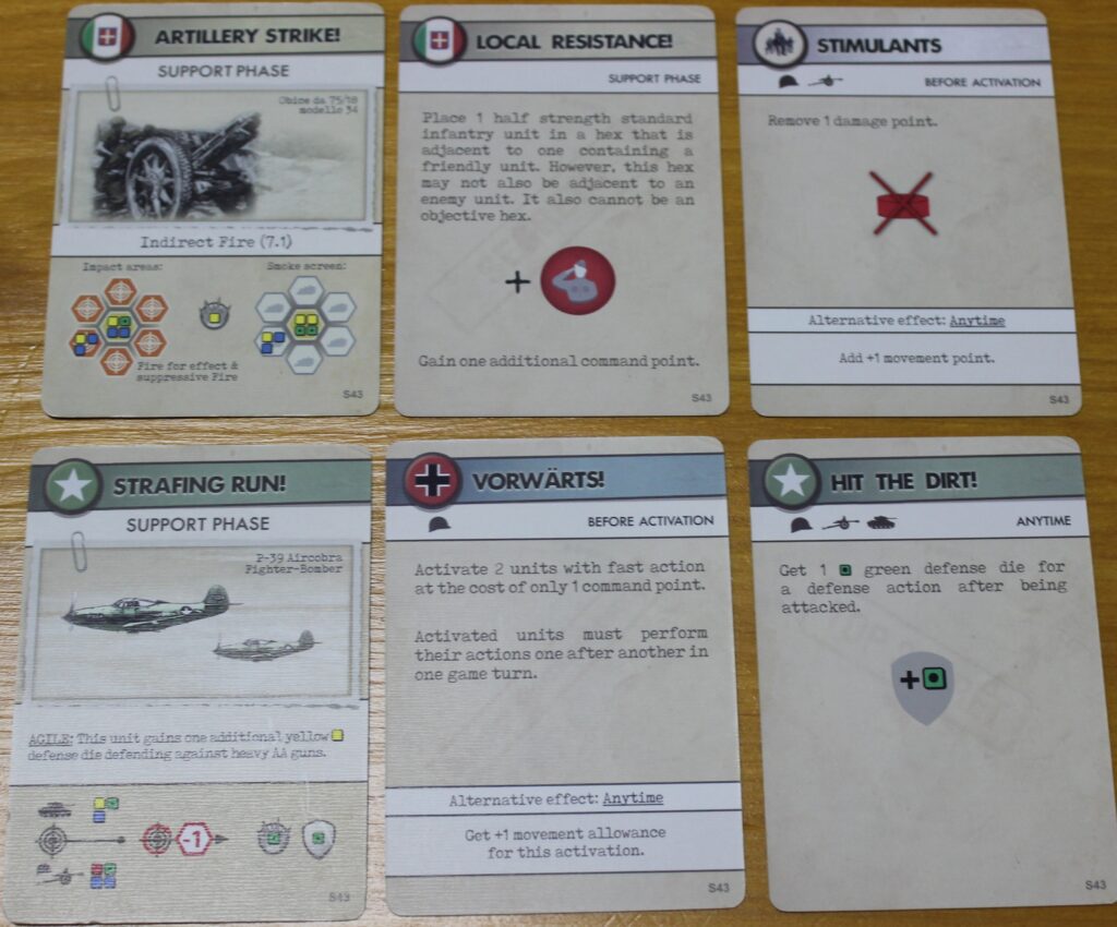 Grundsätzlich darf jede Seite pro Runde 3 Kommandokarten auf der Hand haben. Die Decks für jede Seite werden aus einem fraktionsspezifischen und einem allgemeinen Deck zusammengemischt und dann zufällig gezogen. Die Kommandokarten informieren darüber, wann sie gespielt werden dürfen und welcher Effekt eintritt. Sie stellen sozusagen überraschende Elemente außerhalb der üblichen Regeln dar und sorgen für eine Ungewissheit und Unberechenbarkeit im Spiel. Auch die Karten für TA/OAS werden in das verfügbare Deck für jede Seite mit eingemischt. Die Effekte können Aktionen des Gegners aufheben oder verhindern, Würfelmodifikationen vorgeben oder allgemeine Effekte für die Runde oder eine Einheit beinhalten. Die TA/OAS Karten lassen den Spieler in den Phasen 2-4 Luftangriffe und Artillerieschläge durchführen.