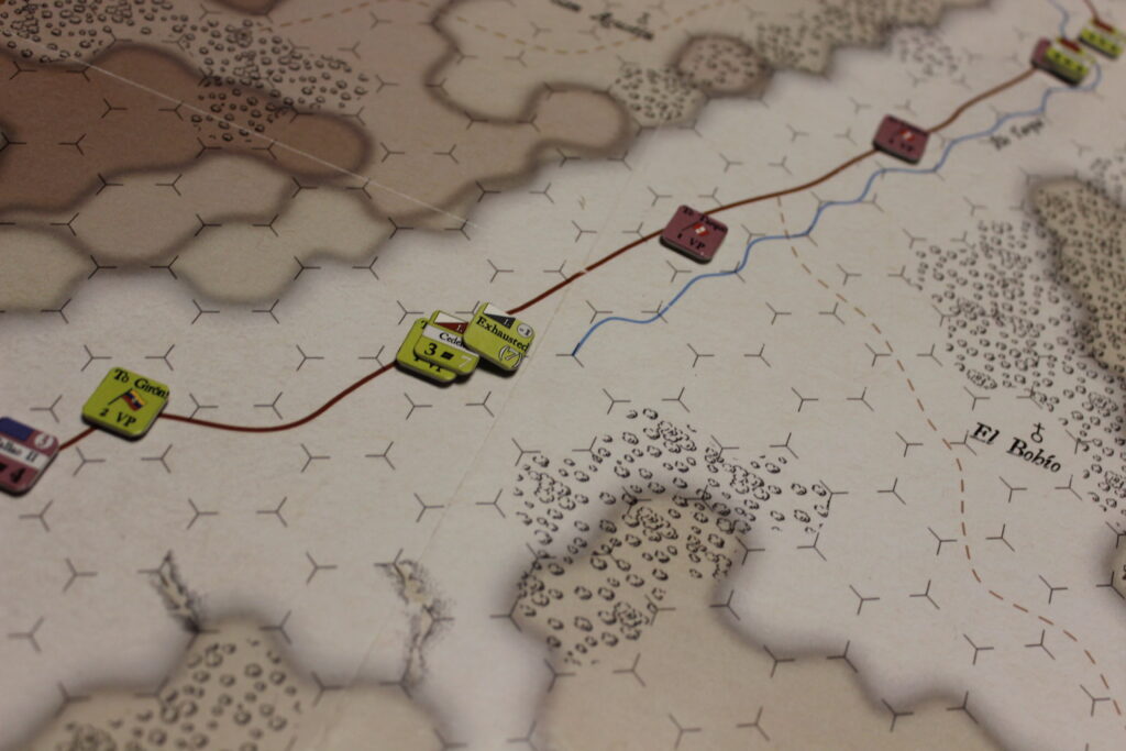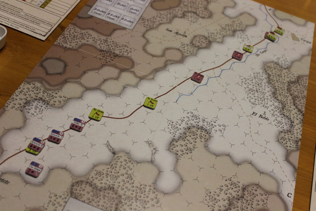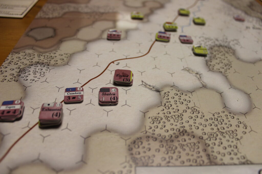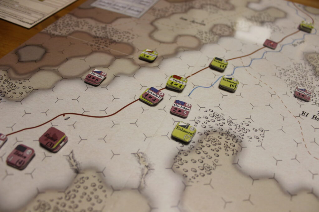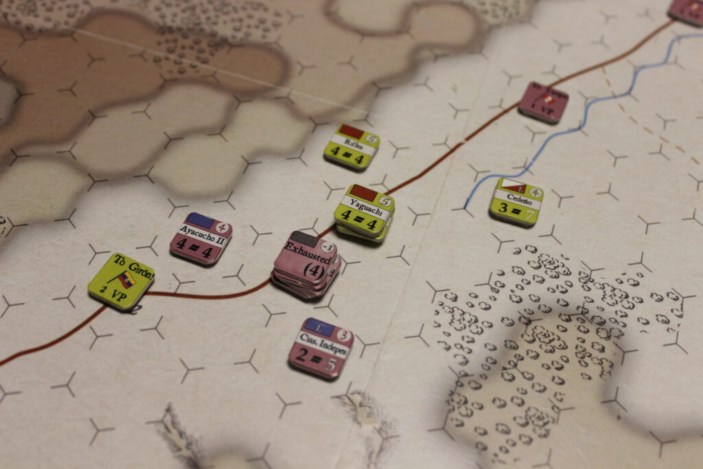 Gleichzeitig haben die Kolumbianer noch zwei leichte Kavallerieeinheiten über die Hänge im Nordwesten herangeführt, um später mit dem Vorteil der höheren Position angreifen oder sich vorbeistehlen zu können. Die Nacht endet und um 7 Uhr verschwindet der Contested VP Marker, den sich kurz zuvor noch die Peruaner sichern konnten, um auch einen Siegpunkt zu ergattern. Ersetzt wird dieser Marker dann durch den Marker To Girón – 2 VP (oben links im Bild zu sehen). Eine sehr schöne Mechanik, welche für ein Verschieben der Frontlinie sorgen kann. Die Kolumbianer hatten ihre Truppen nun auch kurzzeitig zurückgezogen, um Ihnen eine Verschnaufpause zu gönnen (und die Exhausted Marker entfernen zu können, was nur möglich ist, wenn die Truppe nicht in einem Hexfeld direkt neben gegnerischen Truppen steht). Eine Einheit peruanischer leichter Kavallerie hat sich inzwischen zwischen den Linien nach Nordosten in den Wald hindurchgezwängt und bedroht nun auch noch weitere Positionen im Norden, um den Kolumbianern keine Ruhe zu gewähren: