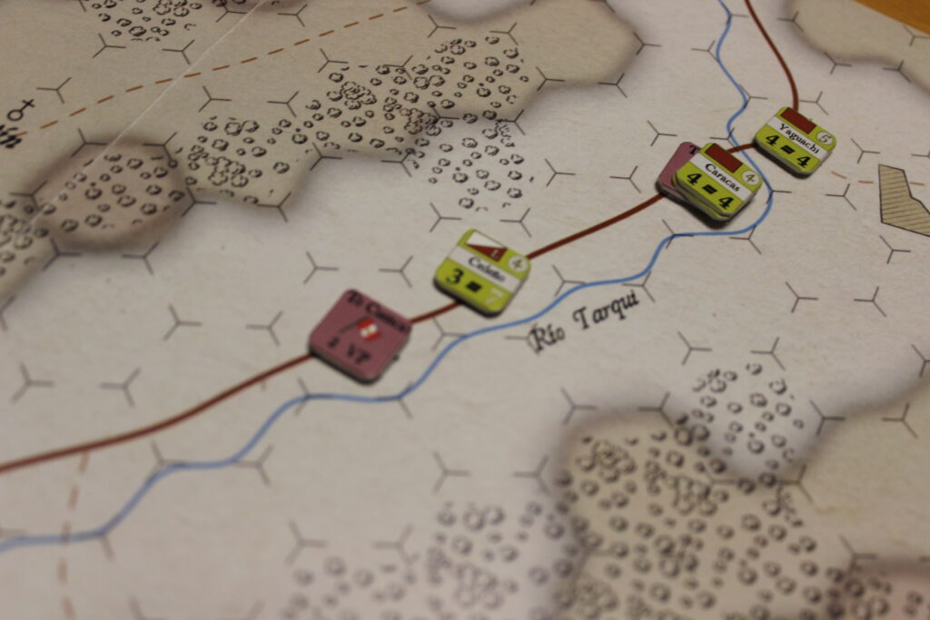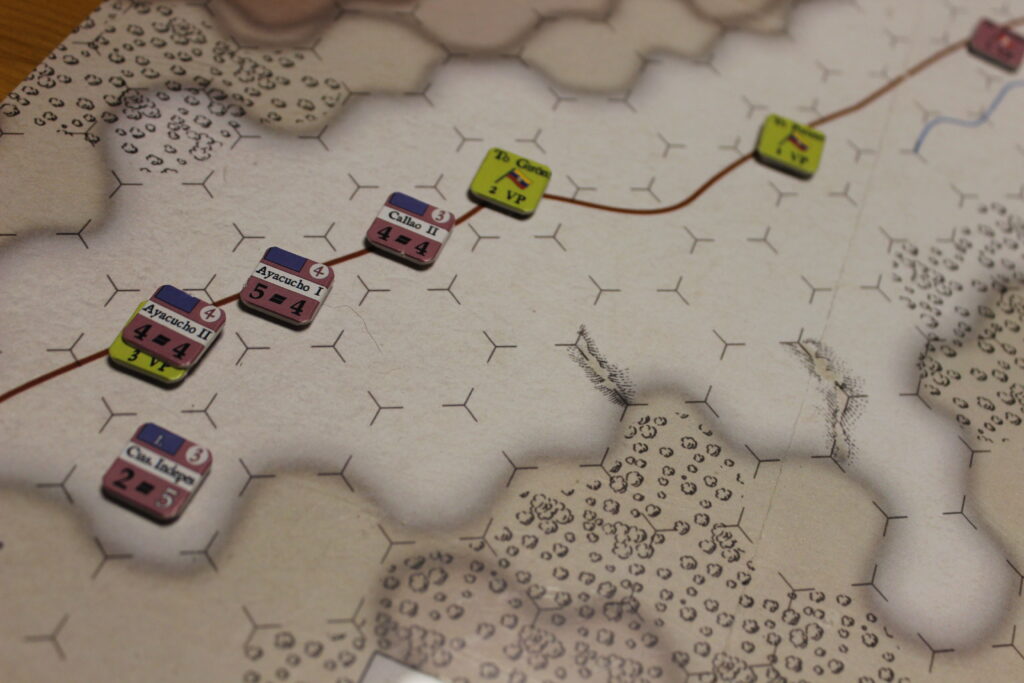 So wird die leichte Kavallerie entlastet und die Peruaner müssen sich nun gut positionieren, um sich ihren Gegnern effektiv entgegenzustellen. Obwohl der Siegpunkt bereits in der letzten Runde von Kolumbien eingenommen wurde, kann auch in dieser Runde hier wieder ein Punkt geholt werden, diesmal von beiden Seiten, solange man das Hexfeld kontrolliert. Daher greift Peru nun an: