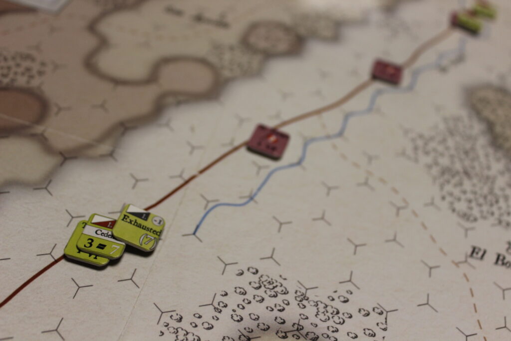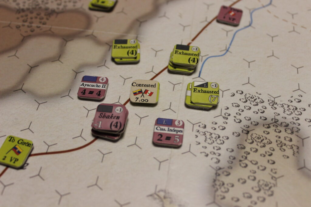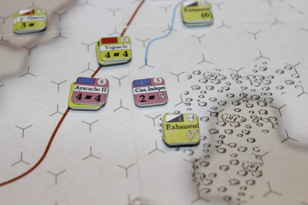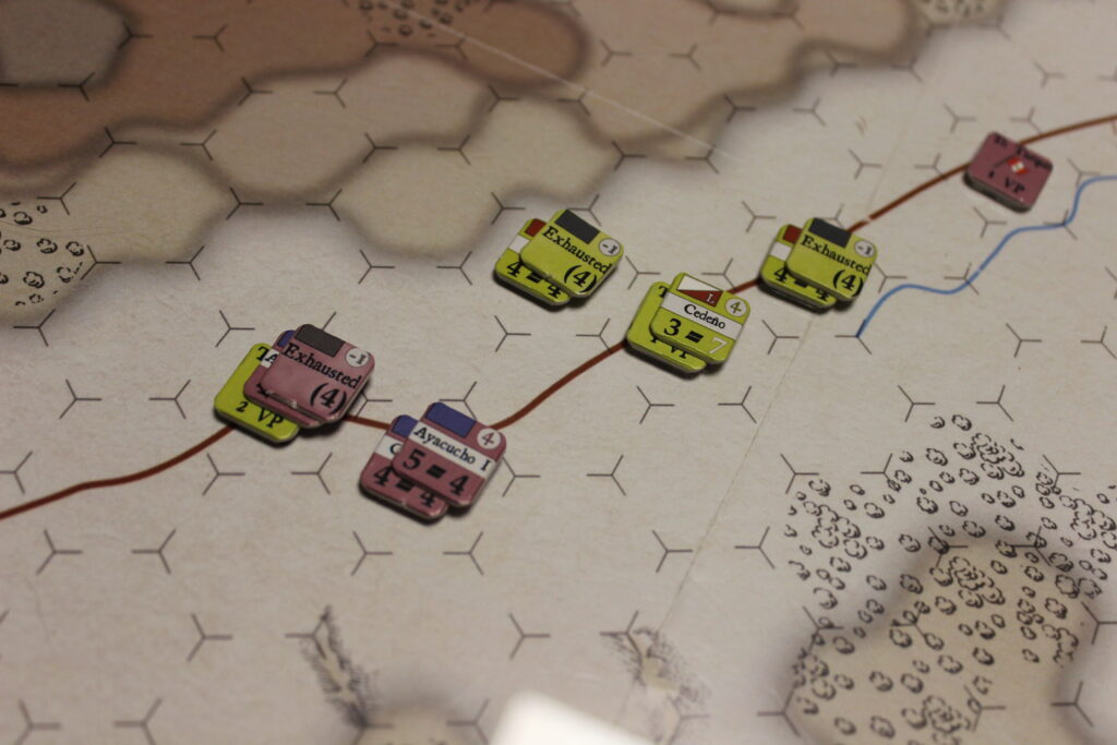 Jedoch haben die Peruaner direkt eine leichte Kavallerieeinheit voraus geschickt, um eine der wichtigen Siegpunktpositionen einzunehmen. Diese Aktion hat allerdings auch dafür gesorgt, dass die Kavallerie erschöpft ist, was für kommende Auseinandersetzungen ein Nachteil ist und außerdem bei erneuter Aktivierung zu einem schnelleren Ende der Spielrunde führen kann. Das kann natürlich ein Vor- oder ein Nachteil sein, je nachdem, was die jeweilige Seite in der Runde noch erreichen will. Der Exhausted (Erschöpft) Counter zeigt auch an, dass bei Würfen gegen den Cohesion Value nun ein niedrigerer Wert genutzt werden muss.