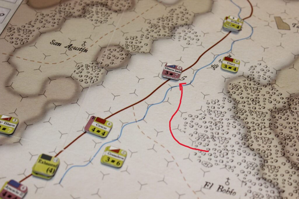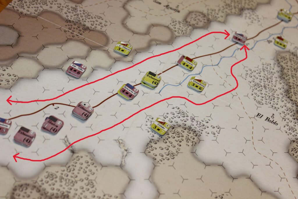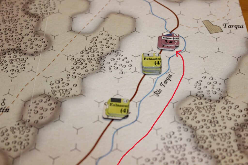 Der Kampf und der anstrengende Marsch sorgen jedoch dafür, dass die peruanischen Infanterietruppen der Verstärkung nur sehr langsam vorankommen und ein wenig im Hinterland stecken bleiben, während sich eine Einheit sogar nahezu in Auflösung befindet und sich von der Front zurückziehen musste (Routed Marker). Nur die Kavallerie konnte man Richtung Norden schicken, um sich der kolumbianischen Kavallerie entgegenzustellen: