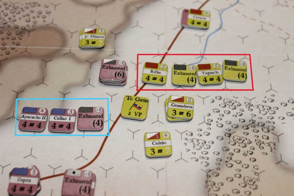 Kampfstärke der Kolumbianer: 8 – Kampfstärke der Peruaner: 8 = 0, daher Spalte 0 auf der CRT. Kolumbien erhält insgesamt für seinen Würfelwurf jedoch einen Würfelmodifikator von +3 und würfelt eine 4. 4+3=7, dies ergibt R1D1. Die kolumbianische Infanterie muss sich ein Hexfeld zurückziehen (R1) und erhält einen Schaden (D1), was Kolumbien einen weiteren Siegpunkt einbringt. Anschließend besetzt die Granaderos Kavallerie den Marker „To Girón“ und sichert sich zwei weitere Siegpunkte. Peru bekommt die drei Siegpunkte von den zuvor erwähnten Husaren im Norden nicht, da nun kein freier Weg zur eigenen Seite mehr besteht.
