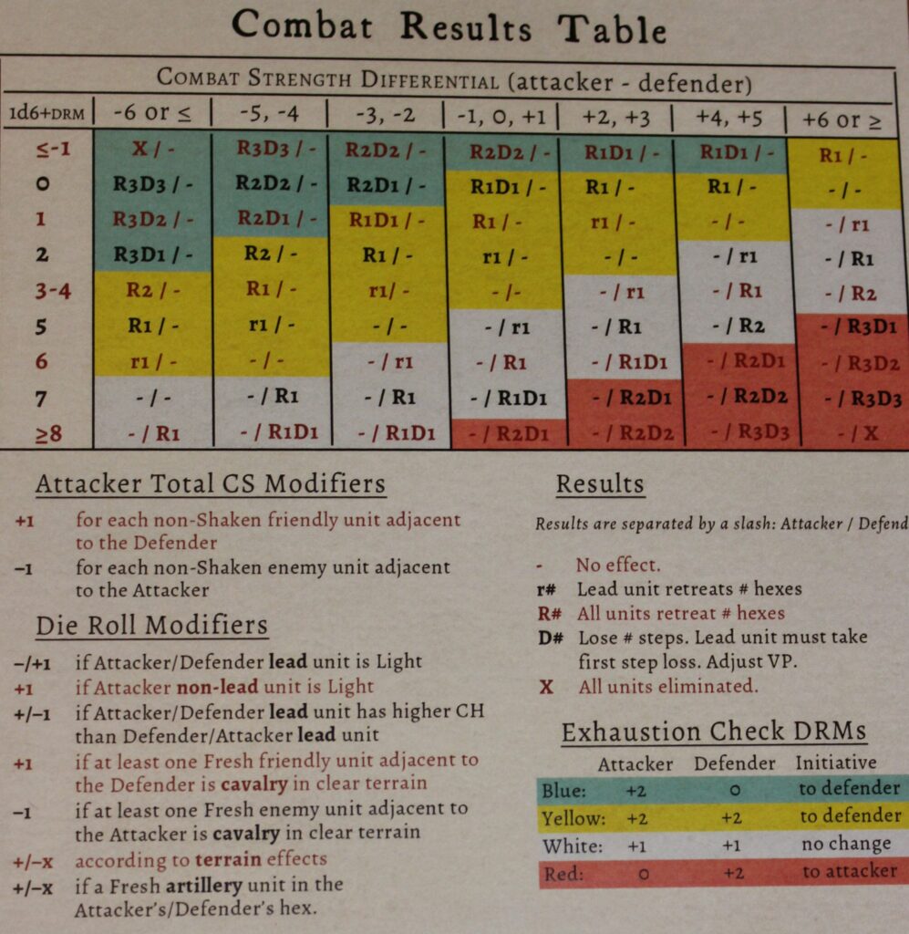 Mit einer Angriffstärke von 8 (4+4) – 2, ergibt sich auf der CRT die Spalte 6 (die Spalte mit den besten Chancen auf gute Ergebnisse für den Angreifer). Kolumbien würfelt eine 6 und erhält +4 durch die leichte Kavallerie und ihren eigenen, besseren Cohesion Value und erzielt somit das beste Ergebnis. Die peruanische, leichte Kavallerie wird komplett aufgerieben und vernichtet. Jeder vernichtete Step (die Striche in der Mitte des Counters, in diesem Fall 2) gibt wieder einen Siegpunkt, sodass Kolumbien sich mit diesem Angriff zwei Siegpunkte sichert.
