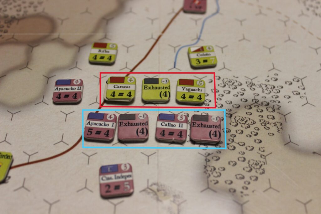 Die peruanischen Truppen (blau umrandet) bringen eine Kampfstärke von 9 Punkten mit, die kolumbianischen eine Kampfstärke von 8. 9-8=1, so wird die Spalte +1 im CRT (Combat Result Table) bestimmt. Peru würfelt einen W6, erzielt eine 5 und bekommt +1 für die Infanterie Ayacucho II, welche im Westen unterstützt. Das Ergebnis ist dann R1, also Retreat 1, sodass sich die kolumbianischen Truppen ein Hexfeld zurückziehen müssen.